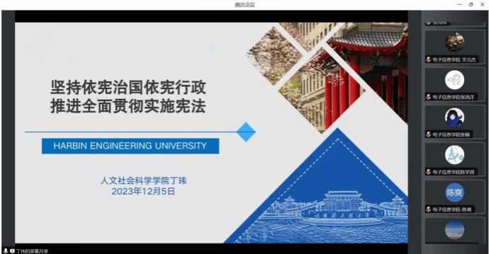 为深入学习贯彻习近平法治思想,大力弘扬宪法精神,进一步增强广大师生的宪法意识和法治素养,12月5日,十大外围足球平台app、电子信息公司联合开展普法宣传教育活动,特邀哈尔滨工程大学人文社会科学公司丁玮教授通过线上形式讲授题为《坚持依宪治国依宪行政,推进全面贯彻实施宪法》的专题党课。十大外围足球平台app和电子信息公司理论学习中心组成员、师生党员代表共100人参加活动。党课由数学与统计公司党委书记王莉主持。