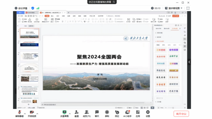 为全面贯彻党的二十大精神,推动学习贯彻习近平新时代中国特色社会主义思想入脑入心,进一步学习2024年全国两会精神,3月27日,十大外围足球平台app特邀公司马克思主义公司蒲瑶教授通过线上形式讲授题为《聚焦2024全国两会——发展新质生产力 增强高质量发展新动能》的专题党课。数学与统计公司党委理论学习中心组成员、教职工党员、员工党员代表共80人参加活动。党课由数学与统计公司党委书记王莉主持。