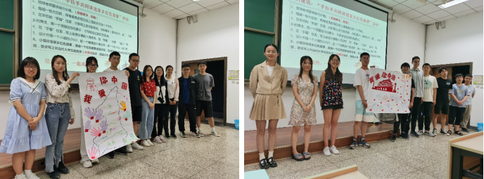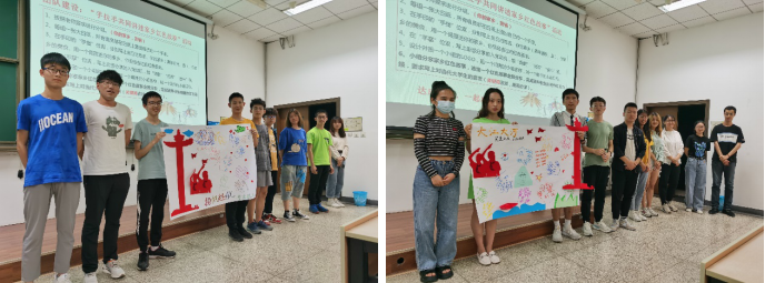 各小组分别展示完成的画报并且讲述海报的设计理念,每个小组成员都分享了自己家乡的特色包括美食,名胜古迹等,然后由主讲同学讲述红色故事,分享红色精神!