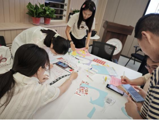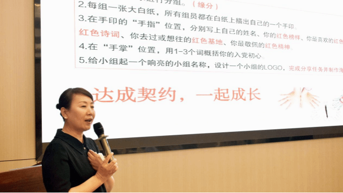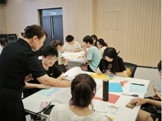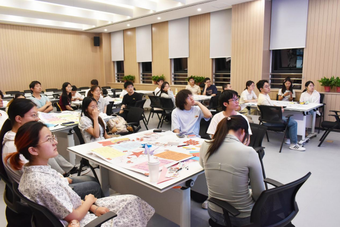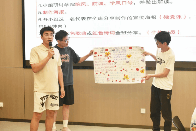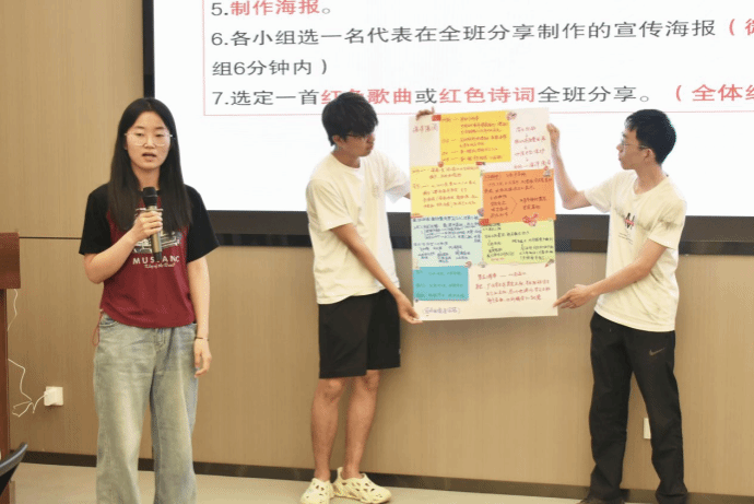 课上,王老师着重强调了团队建设的重要性。学员们被分成5个小组,围绕个人入党初心、红色榜样、红色诗词及红色精神等多个富有意义的主题,结合手绘、拼贴等艺术形式进行了创意性表达,现场气氛高涨。在王老师的指导下,各小组有条不紊地发散思维,并将讨论成果以海报的形式进行呈现。