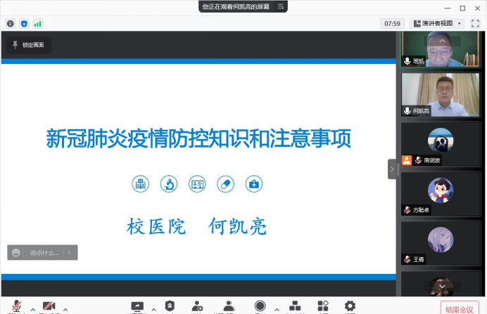为进一步落实公司疫情防控工作有关文件精神,使公司师生党支部成员在寒假期间都能带头做到科学防控,2022年1月27日,十大外围足球平台app办公室党支部经过前期精心策划,邀请校医院何凯亮副经理通过腾讯会议,面向公司理论中心组全体成员,数学科学系党支部、计算科学系党支部、应用概率统计系党支部以及部分员工党支部全体党员共计82人,在线进行新冠肺炎疫情防控知识的宣讲。