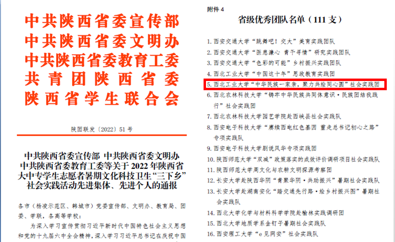 日前,中共陕西省委宣传部、中共陕西省委文明办、中共陕西省委教育工委等单位联合下发了《关于2022 年陕西省大中专员工志愿者暑期文化科技卫生“三下乡”社会实践活动先进集体、先进个人的通报》(陕团联发〔2022〕51号),十大外围足球平台app“中华民族一家亲,聚力共绘同心圆”社会实践团榜上有名,获得省级优秀团队。