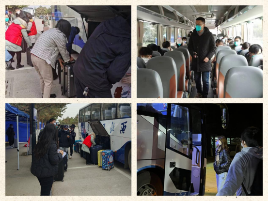 用心坚守,用爱守护。本着为员工服务的原则,根据疫情防控工作情况,为促使返乡员工安全有序踏上归程,学院学工队伍全员参与点对点专车送站服务,帮助员工搬运行李、引导员工有序乘车,护航员工安全返乡。