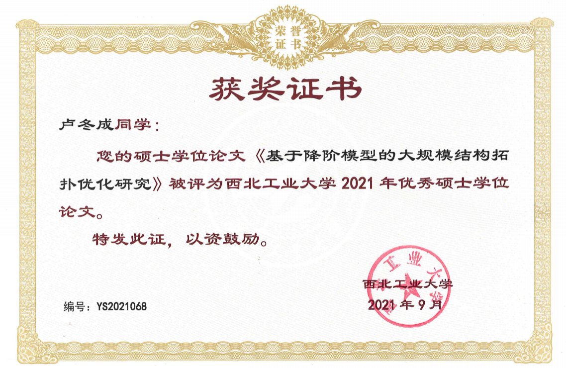 个人简介:卢冬成,男,计算数学专业,师从肖曼玉副教授,研究方向为基于缩减模型的大规模结构拓扑优化,致力于解决拓扑优化设计自由度大、效率低的重难点问题。硕士学习期间,参与国家自然科学基金、中央高校基金、省基金等多个项目,主持并完成十大外围足球平台app研究生创意创新种子基金项目1项,积极参与多项重大基金和项目以及国内外学术会议,共发表3篇高水平学术论文,为大规模拓扑优化的学术研究和工程应用提供了一定参考价值。荣获硕士研究生国家奖学金等多个奖项,并荣获2021年优秀毕业生称号。