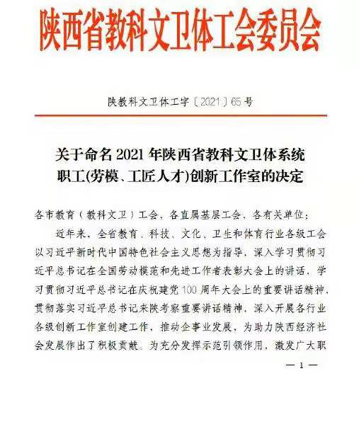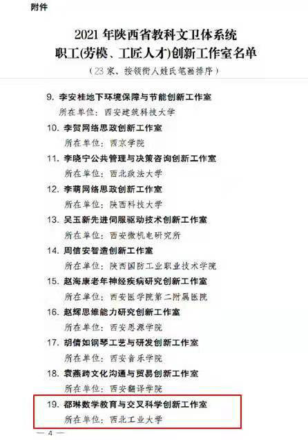 日前,从陕西省教科文卫体工会传来喜讯,在公布的23所“2021年陕西省教科文卫体系统职工(劳模、工匠人才)创新工作室”名单中,由十大外围足球平台app都琳教授领衔成立的“都琳数学教育与交叉科学创新工作室”榜上有名,正式获批挂牌。