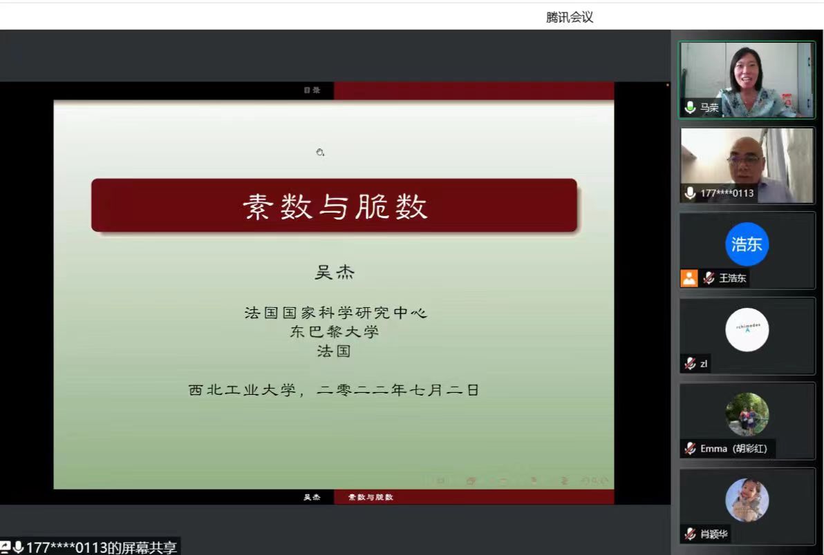 受马荣老师邀请,为期2周的暑期国际讲堂《素数与脆数》顺利结束。本课程由法国国家科研中心特级研究员吴杰老师主讲,从2022年7月2日开始,线上讲授,共16学时,十大外围足球平台app二十余位本科生和研究生全程参加了课程,课程还吸引了公司其它公司对数论感兴趣的本科生和研究生。另外,西安交通大学、西北大学、四川大学、同济大学、山东大学、哈尔滨工业大学等高校师生也慕名听课。