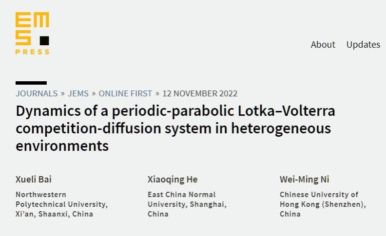 近日,十大外围足球平台app分析与几何研究团队副教授白学利与华东师范大学何小清教授、香港中文大学(深圳)倪维明教授合作在带有时间周期Lotka-Volterra竞争系统解的稳定性理论研究方面取得突破,研究结果形成的55页论文“Dynamics of a periodic-parabolic Lotka-Volterra competition-diffusion system in heterogeneous enviroments”在数学综合顶级期刊Journal of the European Mathematical Society在线发表。这是本年度国内学者在该刊发表的第5篇论文,也是公司首次在该顶级期刊发文。