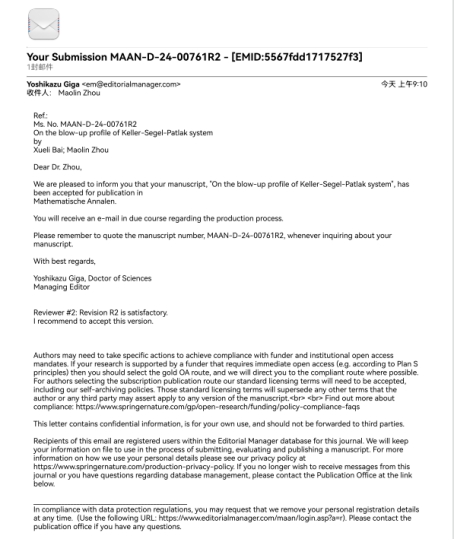 近日,十大外围足球平台app分析与几何研究团队青年教师白学利教授与南开大学周茂林教授合作,在Keller-Segel-Patlak模型的解的爆破形状精确刻画方面取得突破,研究结果“On the blow-up profile of Keller-Segel-Patlak system”被数学综合期刊Mathematische Annalen接收,这是公司继姚磊教授之后再次在该著名数学综合期刊发文。