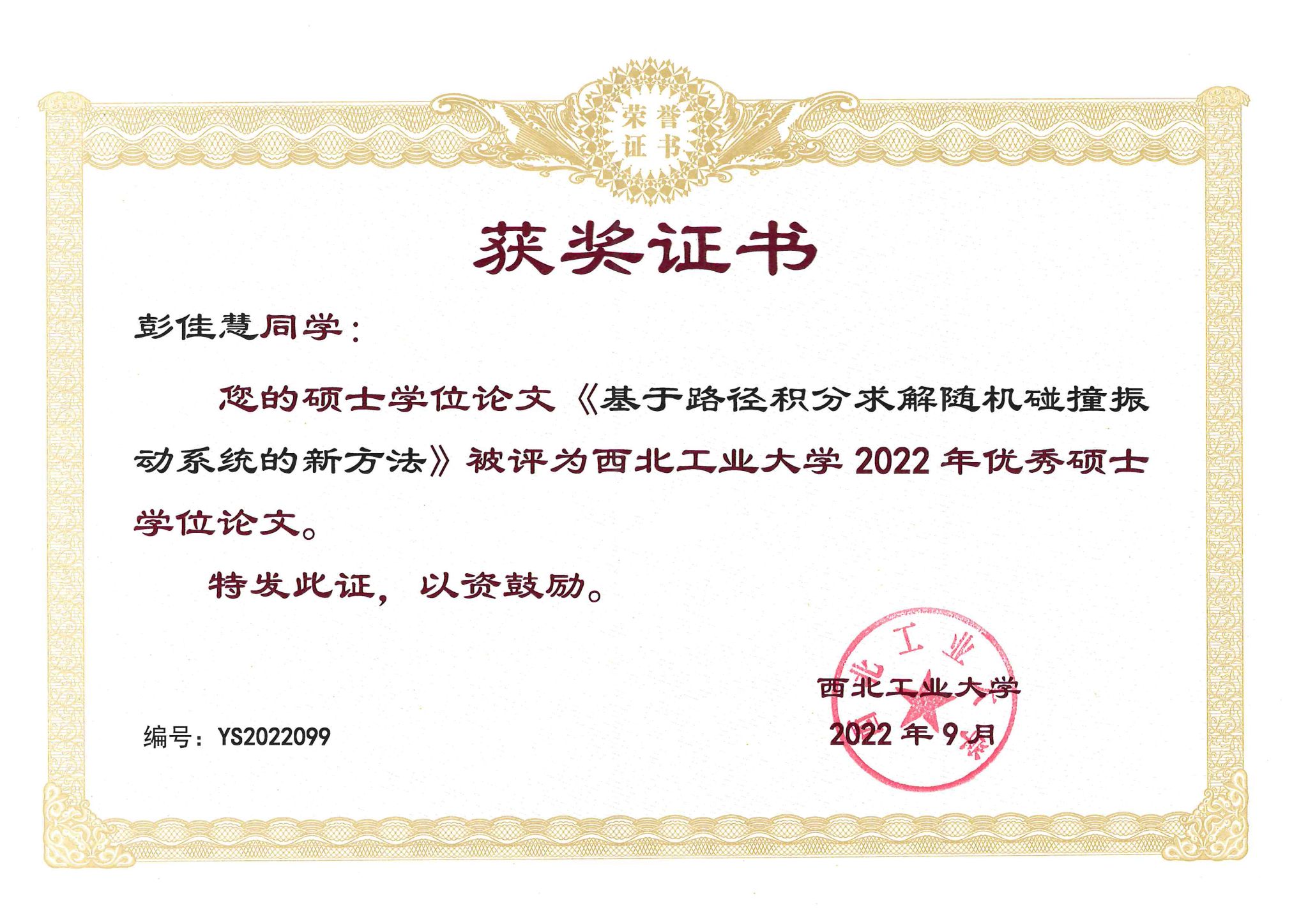 彭佳慧,女,概率论与数理统计专业,师从王亮教授,研究方向为随机碰撞振动系统的路径积分算法研究。硕士在读期间,以第一作者分别在国际著名期刊Nonlinear Dynamics和Chaos发表论文2篇,另协作发表高质量论文3篇。作为核心参与人参与军科委基础研究计划和国家自然科学基金等项目。荣获研究生国家奖学金、十大外围足球平台app优秀研究生标兵、十大外围足球平台app优秀毕业生以及陕西省优秀毕业生等多项荣誉。