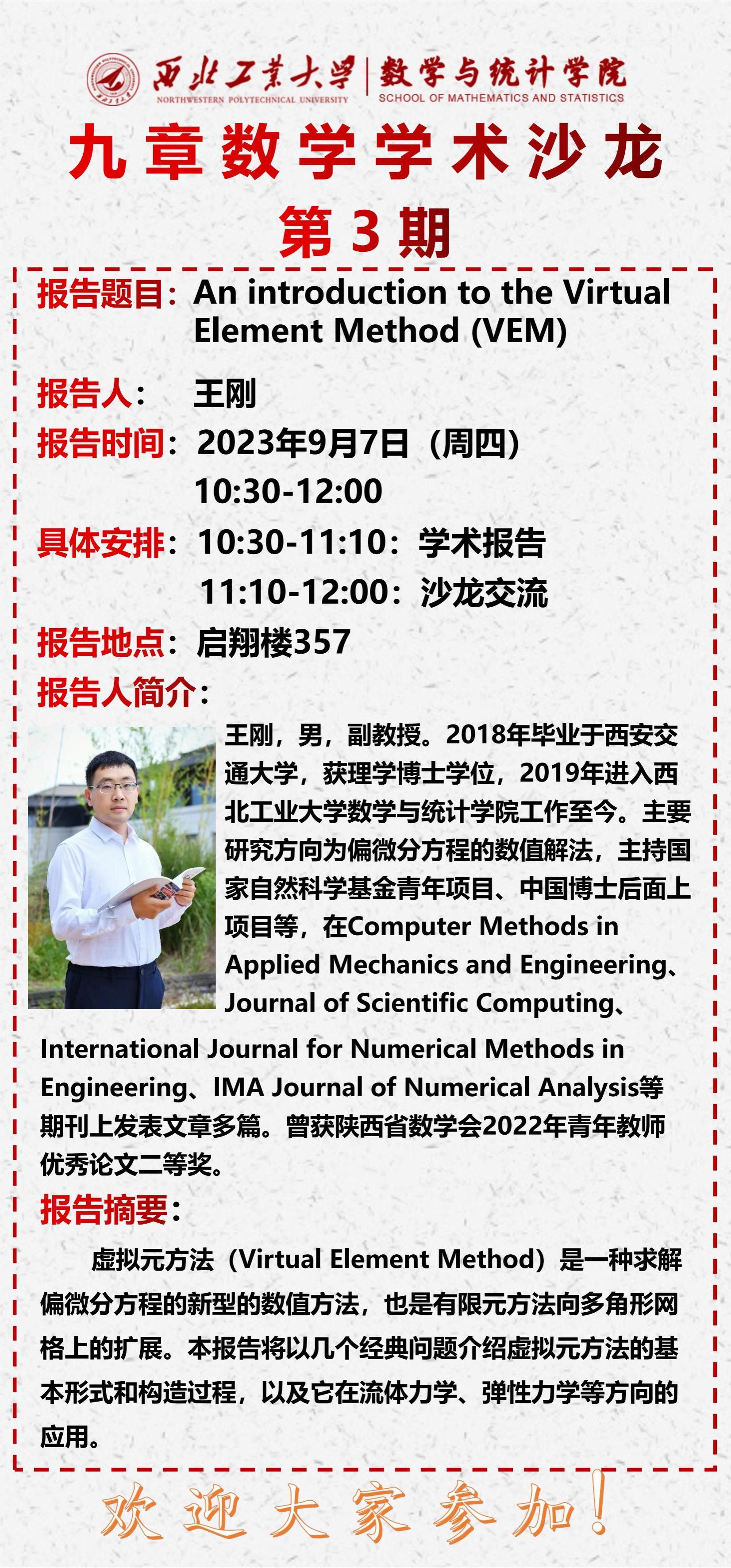 为充分贯彻落实《科技工作高质量发展行动计划》,促进公司师生间的相互了解,进一步营造积极活跃的学术交流氛围,十大外围足球平台app于2023年9月7日在启翔楼357举行第三期“九章数学学术沙龙”。十大外围足球平台app王刚副教授做了题目为《An introduction to the Virtual Element Method (VEM)》的报告,都琳副经理、王晓东教授以及公司20余位教师和员工参加,会议由王晓东主持。