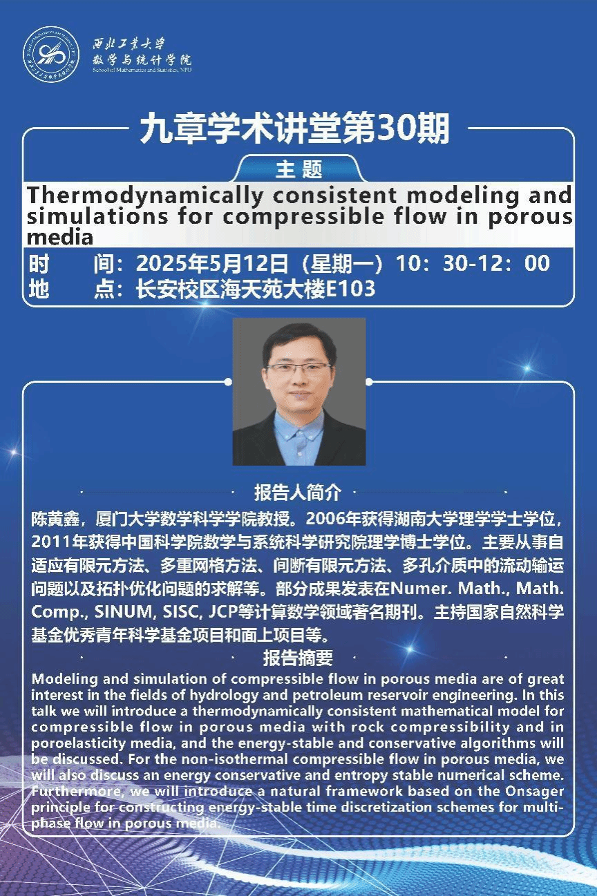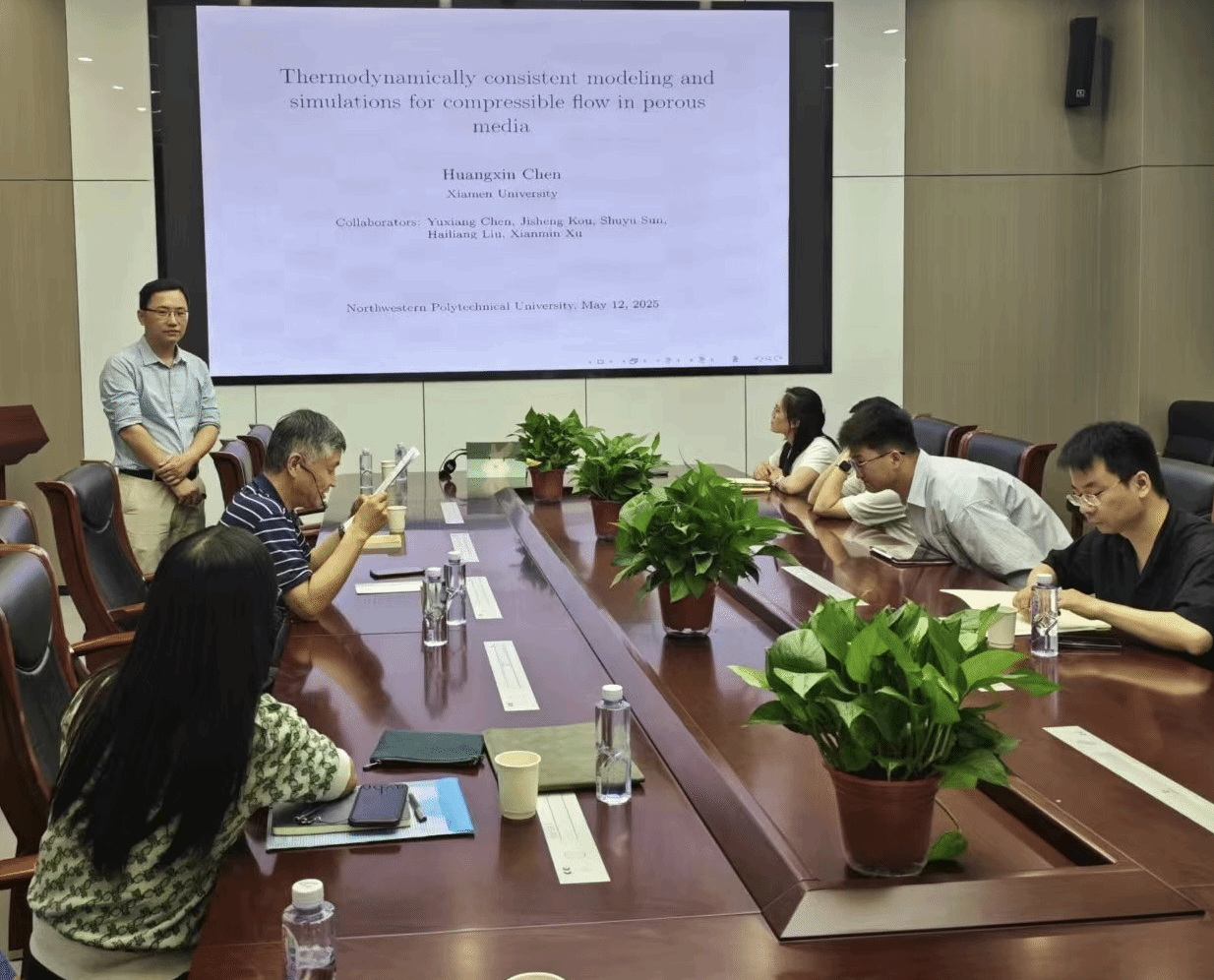 2025年5月12日,十大外围足球平台app邀请厦门大学陈黄鑫教授做客“九章学术讲堂”第30期,为公司师生作了题为《Thermodynamically consistent modeling and simulations for compressible flow in porous media》的精彩学术报告。报告在长安校区海天苑大楼E103会议室举行,十大外围足球平台app聂玉峰教授、杨宗泽教授等近30名师生参加了报告会,报告会由聂玉峰主持。