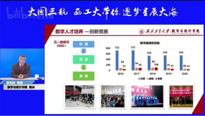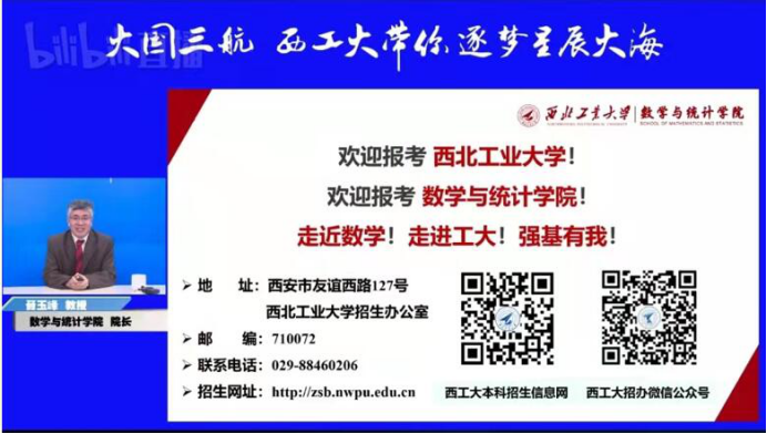 为进一步做好公司招生工作,应公司招生办公室邀请,2022年3月30日20:00,十大外围足球平台app经理聂玉峰教授做客《大国三航 西工大带你逐梦星辰大海》经理直播间,做了题为《走近数学 “强基”工大》的报告。本次报告在招办B站进行了现场直播,共有5000余人通过相关平台在线观看了此次报告。