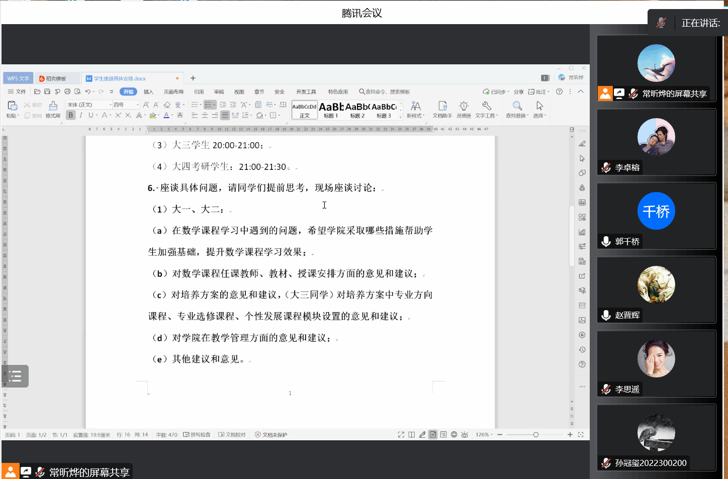为贯彻落实一流本科人才培养行动计划,提高立德树人质量,2023年1月6日,十大外围足球平台app召开期末本科生线上座谈会。十大外围足球平台app教学副经理郭千桥,经理助理刘晓刚,教学秘书常昕烨、李思遥、李卓榕,及本科四个年级的员工代表参加了本次会议。
