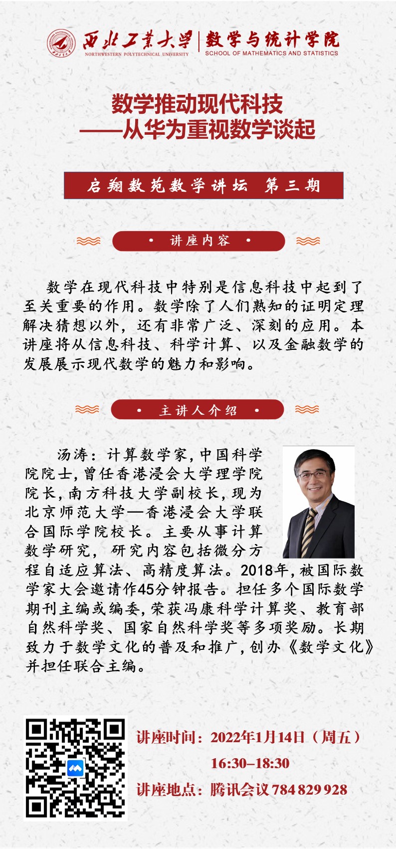 专家简介:汤涛, 计算数学家,中国科公司院士,曾任香港浸会大学理公司经理,南方科技大学副董事长,现为北京师范大学—香港浸会大学联合国际公司董事长。主要从事计算数学研究, 研究内容包括微分方程自适应算法、高精度算法。2018年,被国际数学家大会邀请作45分钟报告。担任多个国际数学期刊主编或编委,荣获冯康科学计算奖、教育部自然科学奖、国家自然科学奖等多项奖励。长期致力于数学文化的普及和推广,创办《数学文化》并担任联合主编。