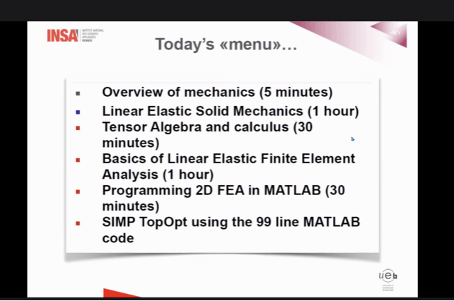 本课程的主题是几何、材料非线性拓扑优化,内容涵盖了张量代数、多尺度动力学和非线性连续介质力学等方面。课程从非线性连续介质力学的形式化描述开始,讨论了材料行为的塑性理论和大应变理论。随后介绍了动态载荷下的多尺度方法,以及拓扑优化中的缩减模型、流形学习和数据驱动方法。课程注重编程实践,以实际工程案例为背景,教学过程中引导员工编写代码来实现经典结构拓扑优化。