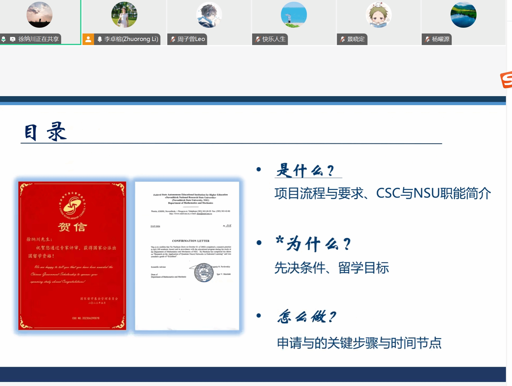 在会上,李卓榕老师围绕 “项目介绍”“资助办法” 及 “成长路径” 三个核心板块展开详细讲解。在项目介绍环节,李老师深入解读了国家建设高水平大学公派项目、创新型人才合作培养项目、俄乌白国际合作培养项目,以及公司各类长短期交流项目的具体申请要求、前期准备工作要点和需要特别注意的事项等关键信息。李老师积极鼓励同学们充分利用公司提供的优质平台和丰富资源,踊跃报名参加各类国际交流活动,如旨在培养未来行业领军人物的领军人才项目、让本科生在国外完成毕业设计积累经验的本科赴外毕设项目、促进学术交流与学位提升的学分/学位交换项目,还有拓宽视野的寒暑期夏令营、聚焦前沿知识的暑期国际学堂,以及能够与国际学者交流学术成果的国际会议等。