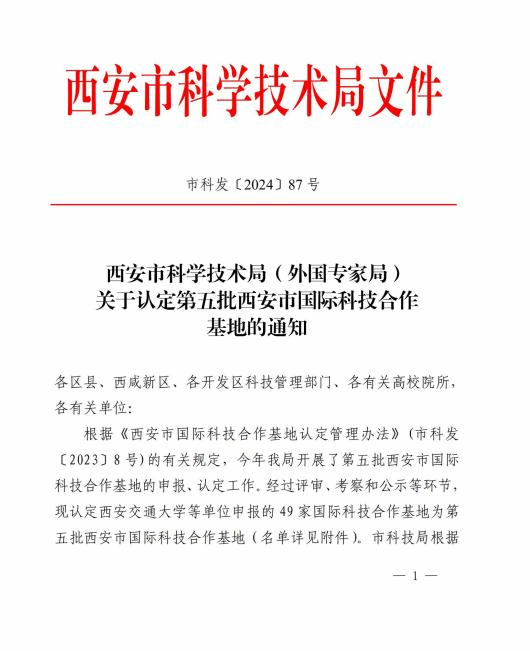 The Science and Technology Bureau of Xi'an (the Foreign Expert Affairs Bureau of Xi'an) recently announced the recognition of the fifth batch of Xi'an International Science and Technology Cooperation Bases. Among them, the "Xi'an International Science and Technology Cooperation Base for Complex Data Modeling and Intelligent Computing," led by the School of Mathematics and Statistics, has been officially approved.