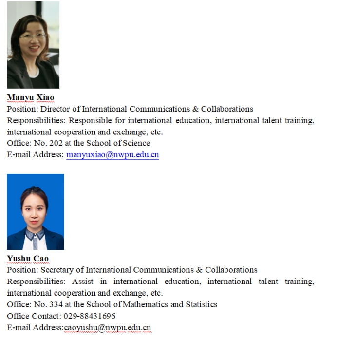 In order to strengthen international communications and collaborations and to improve the quality of higher education, the Office of International Communications and Collaborations was established after the meeting discussion of the School of Mathematics and Statistics on November 15th, 2021. The Office is responsible for international education, international talent cultivation, international exchanges and cooperation, etc. Associate Professor Manyu Xiao holds the office as the Director of International Communications and Collaborations and Ms.Yushu Cao assists as the secretary of International Communications and Collaborations.