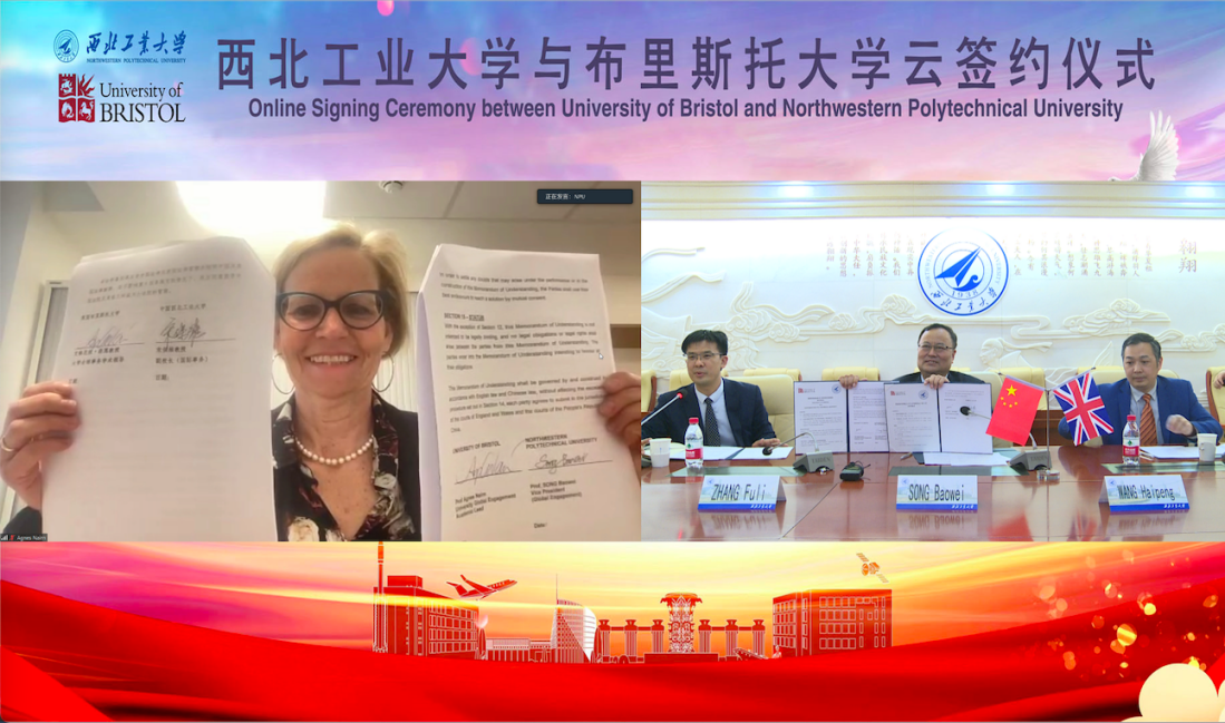 The signing ceremony was held online on March 16 between University of Bristol and NPU about the four-year system (3+1 undergraduate and postgraduate continuous education talentcultivation project) in the field of engineering. Song Baowei, Vice President of NPU, and Agnes Nain, Vice President of Bristol University attended the ceremony. The heads of the International Cooperation Offices and Academic Affairs Offices of the two universities, as well as the relevant leaders such as Du Lin, Vice President of School of Mathematics and Statistics, and Associate Professor Manyu Xiao, Director of the Office of International Communications and Collaborations, attended the signing ceremony. For the students of NPU, we will open up the talent cultivation plans for the continuous study of undergraduate and postgraduate in the three directions of mathematics and applied mathematics, information and computational science and statistics, so as to open up a new path for the continuous study of undergraduate and postgraduate students in the follow-up personnel training.